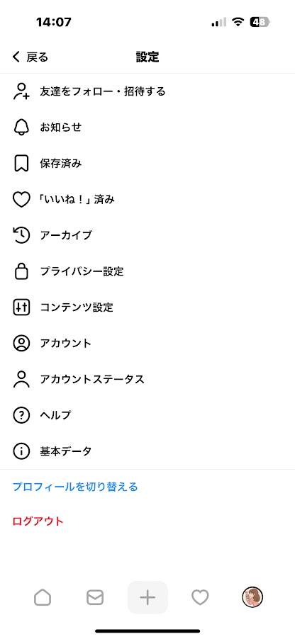 - プロフィール画面右上の「≡」→「コンテンツ設定」→「非表示ワード」へ。