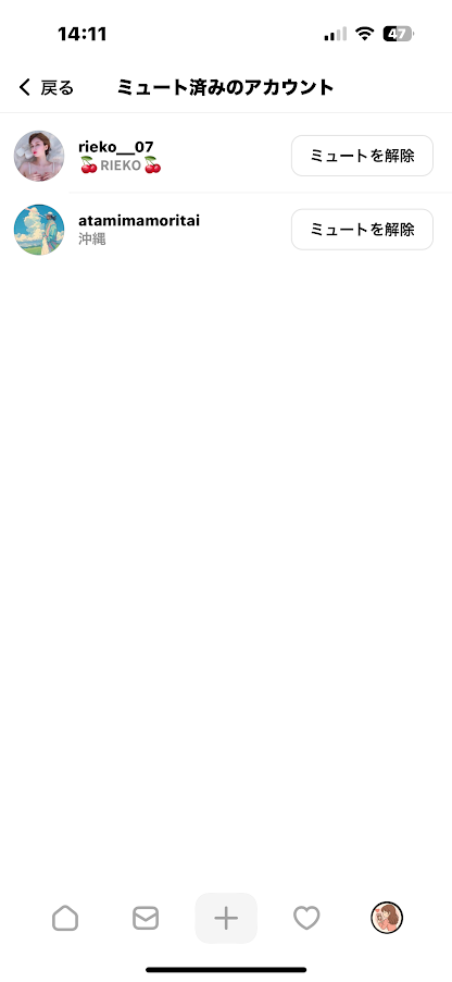 - ミュートしているアカウントが一覧で表示されます。