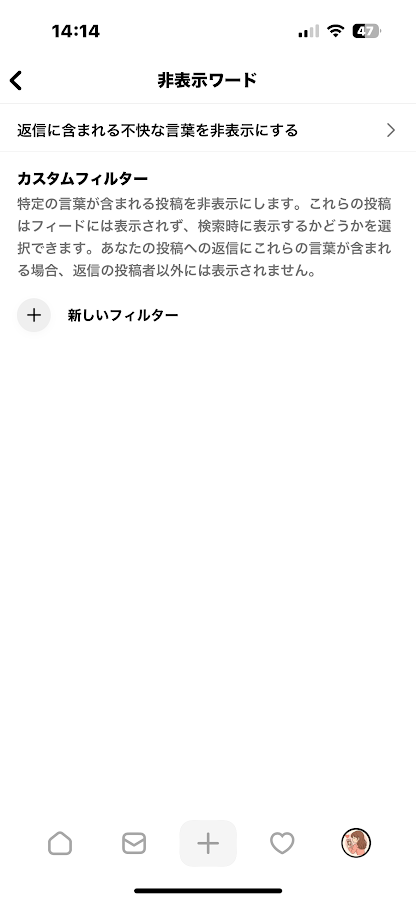 特定の単語・フレーズ・絵文字を含む投稿を、自動で非表示にする高度なフィルタ機能です。 ネタバレ・炎上・政治など、見たくない話題を避けたいときに便利です。